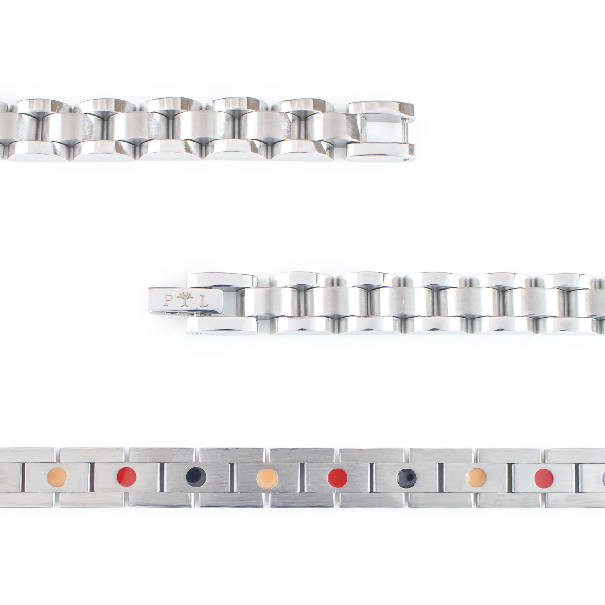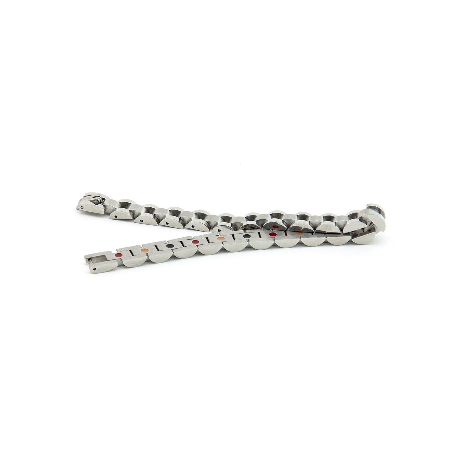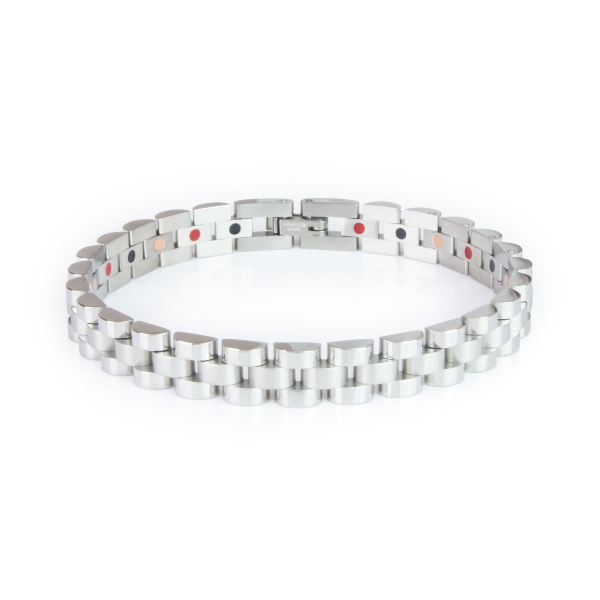 - Stainless steel links with subtle center contrast and polished borders.