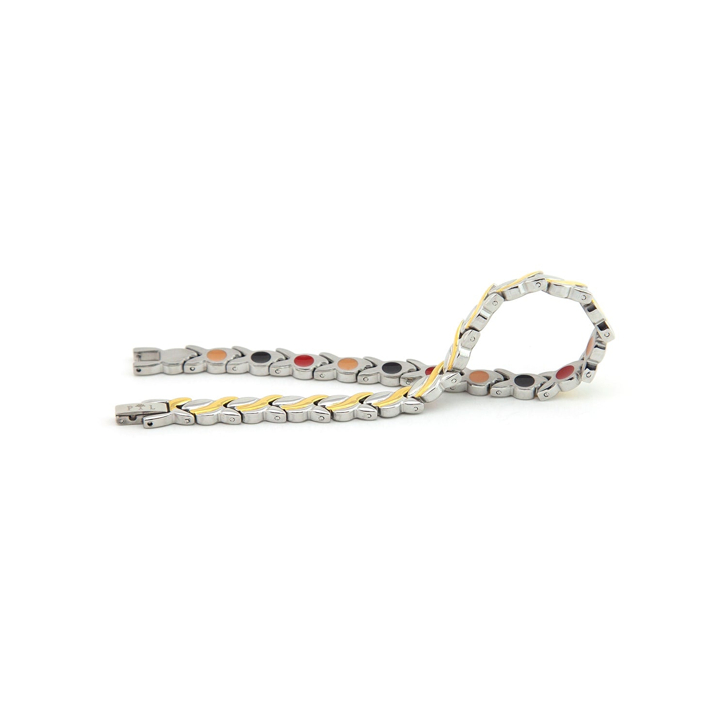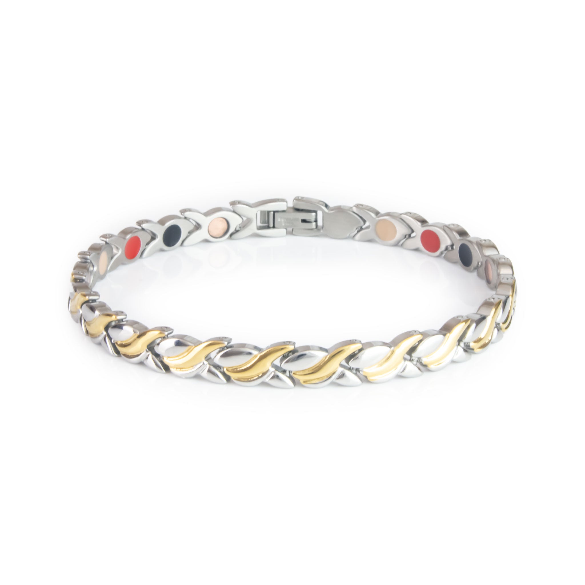 The Duet bracelet harmonizes elegance and balance through its graceful blend of stainless steel and gold-plated accents. Each sculpted link flows in a wave-like motion, where polished gold curves intertwine with sleek steel in a fluid dance of light and texture. Within this refined form lies a row of embedded negative ion elements, designed to inspire calm and inner equilibrium. With its dual-tone shimmer and unisex appeal, Duet celebrates the beauty of contrast in perfect rhythm.