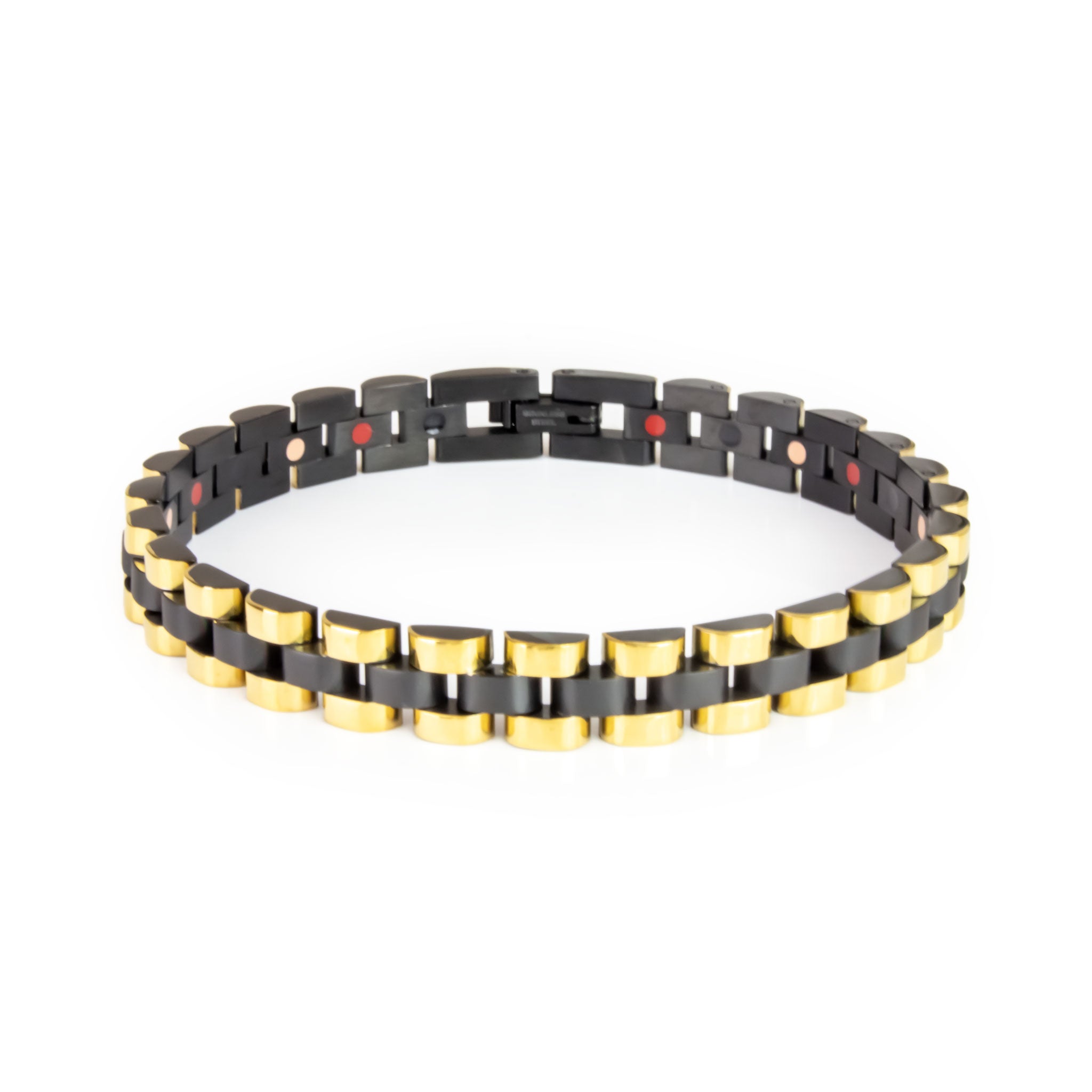 - Unisex bracelet with matte black center links and polished gold borders for striking contrast.