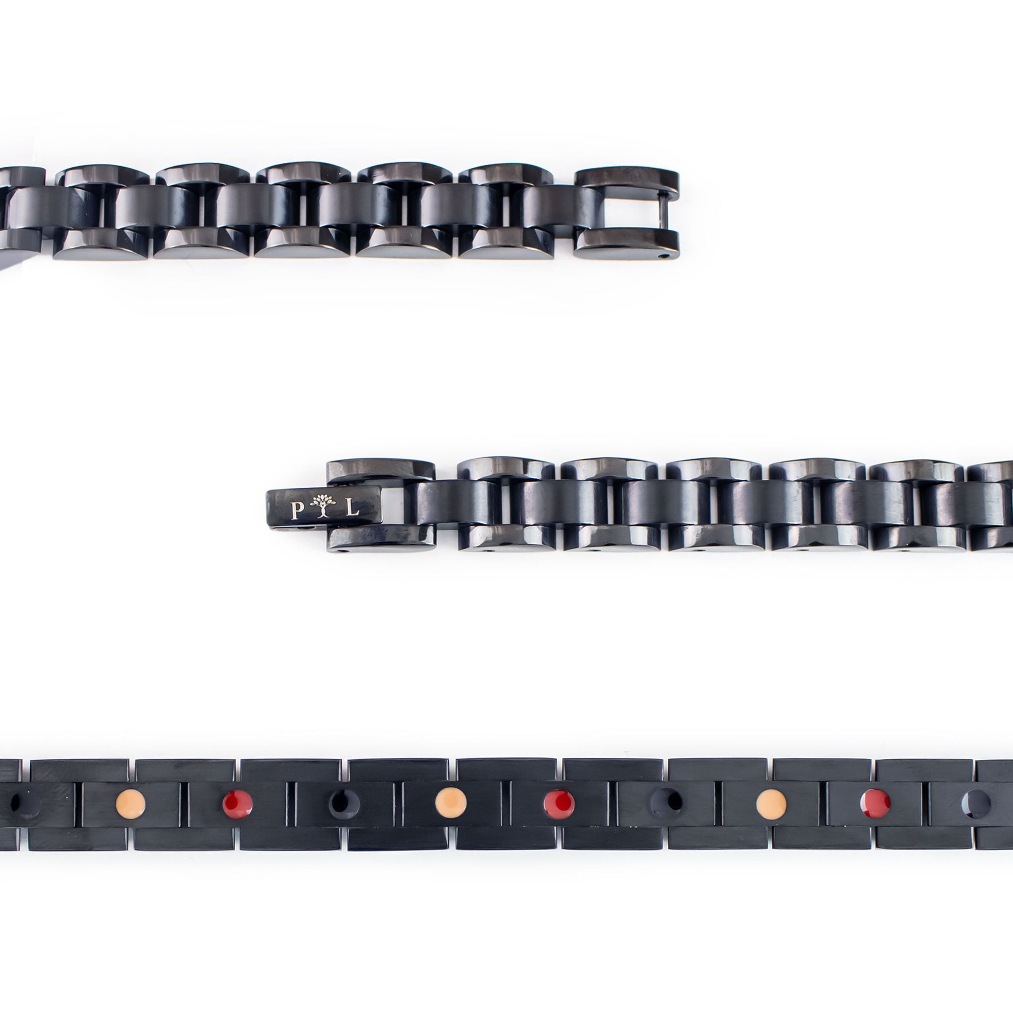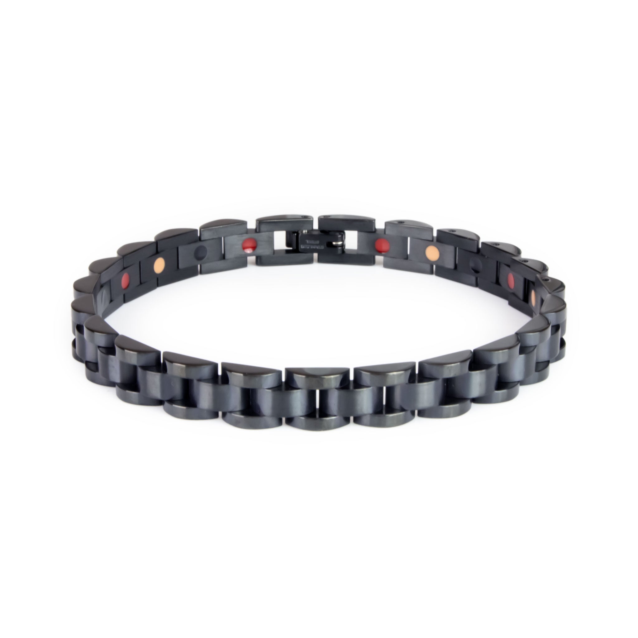 Embrace quiet strength with Black Knight. This unisex black stainless steel bracelet features matte center links framed by polished black rows, creating a sleek contrast. Embedded negative ion elements support balance and inner calm. Rugged yet refined, Black Knight complements any look with its confident, minimalist edge.