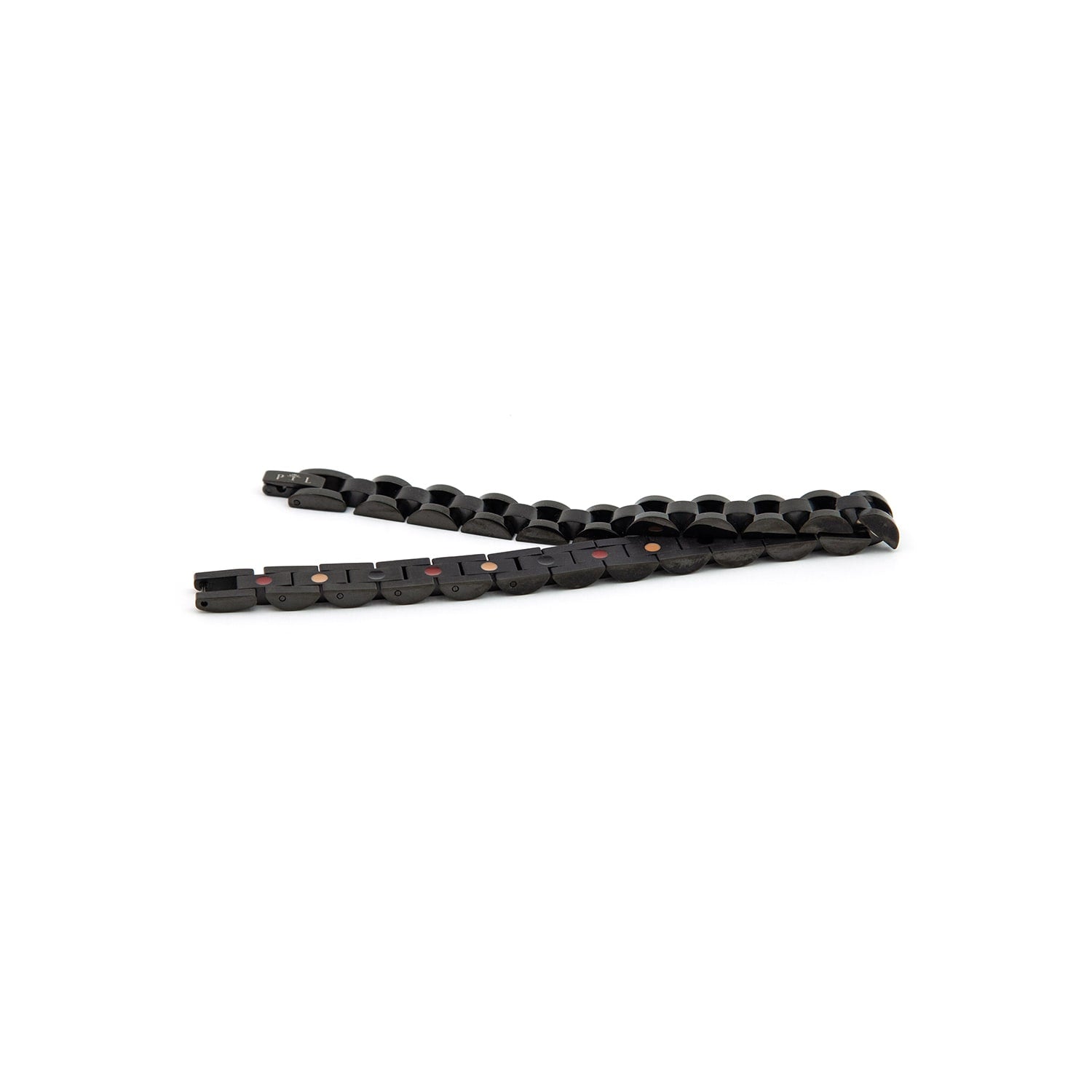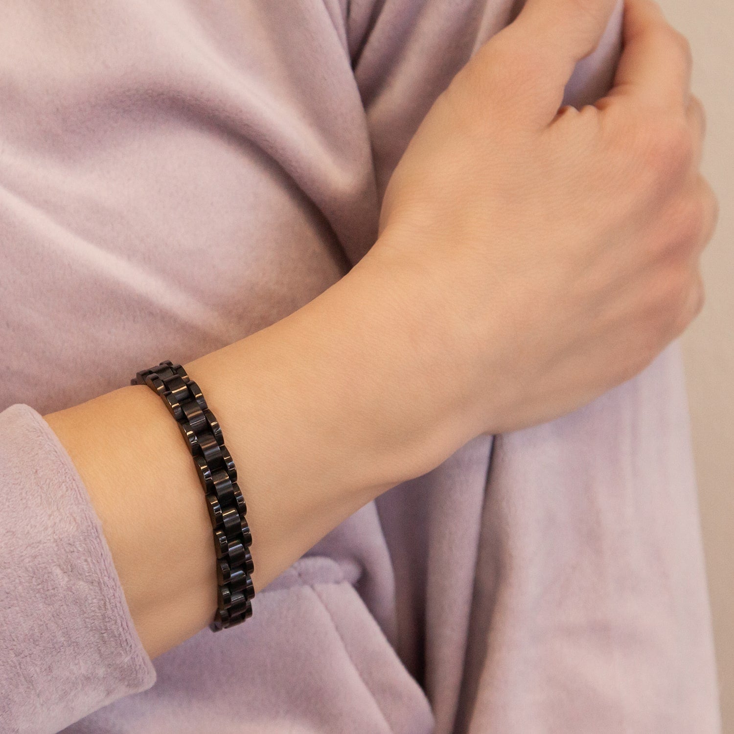 • Matte black center links bordered by polished black edges for subtle contrast.